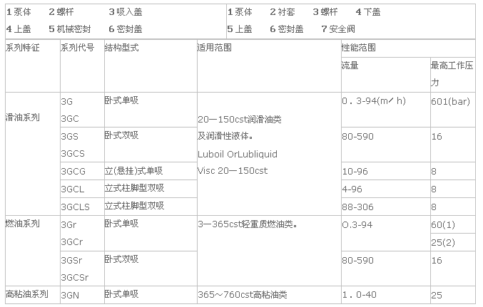 3G螺杆泵所輸液體為各種不含固體顆粒,無(wú)腐蝕性油(yóu)類及(jí)類似油的潤滑性液體,所輸液體粘度(dù)為1.2-100E(3.0-760cst),高粘度液體亦可通過加溫降粘後輸送.